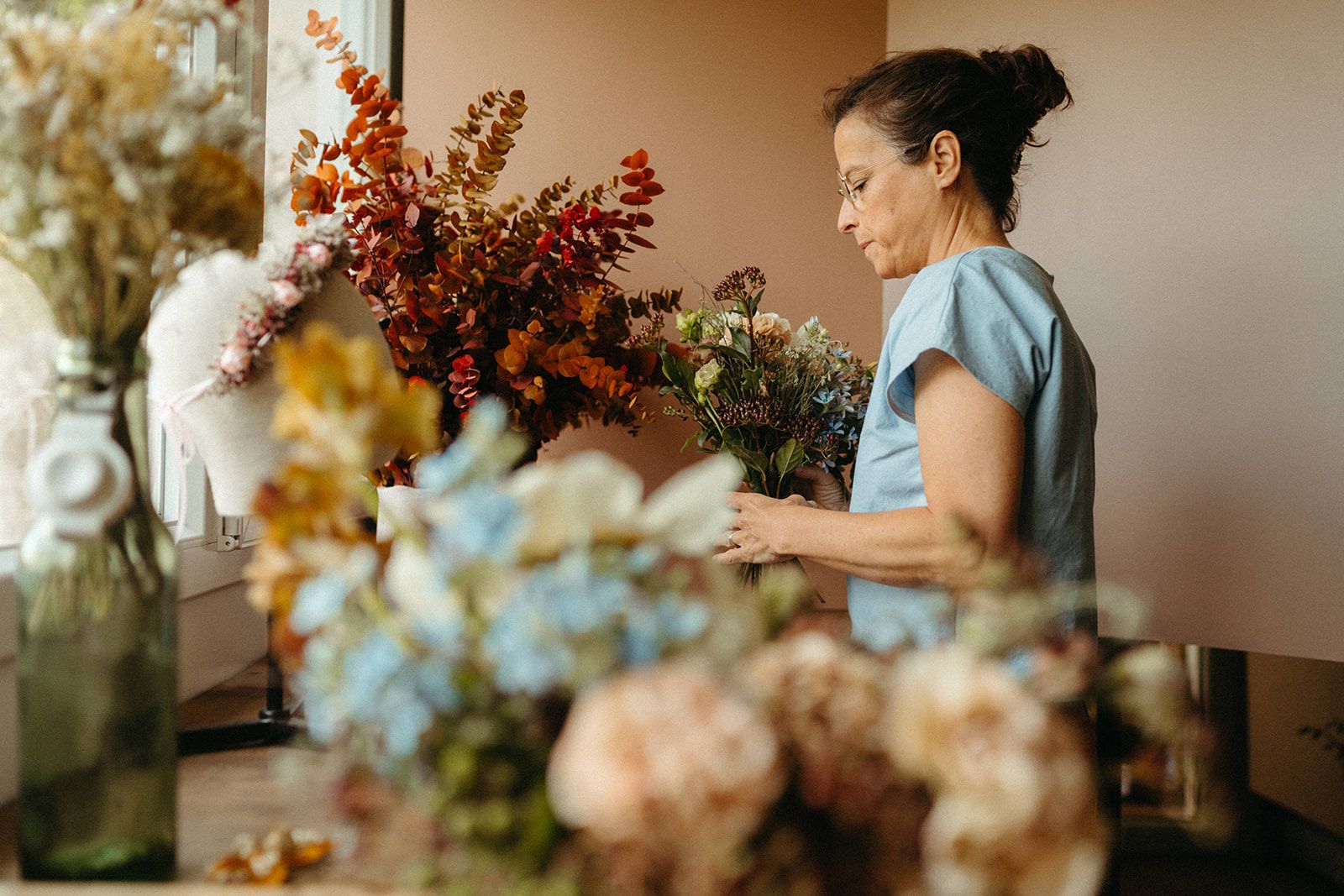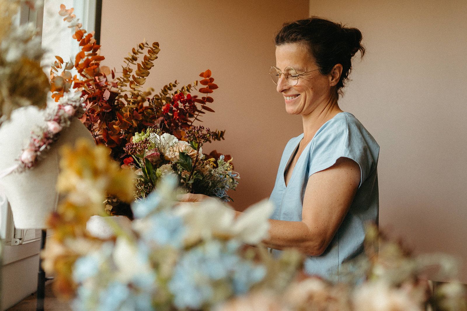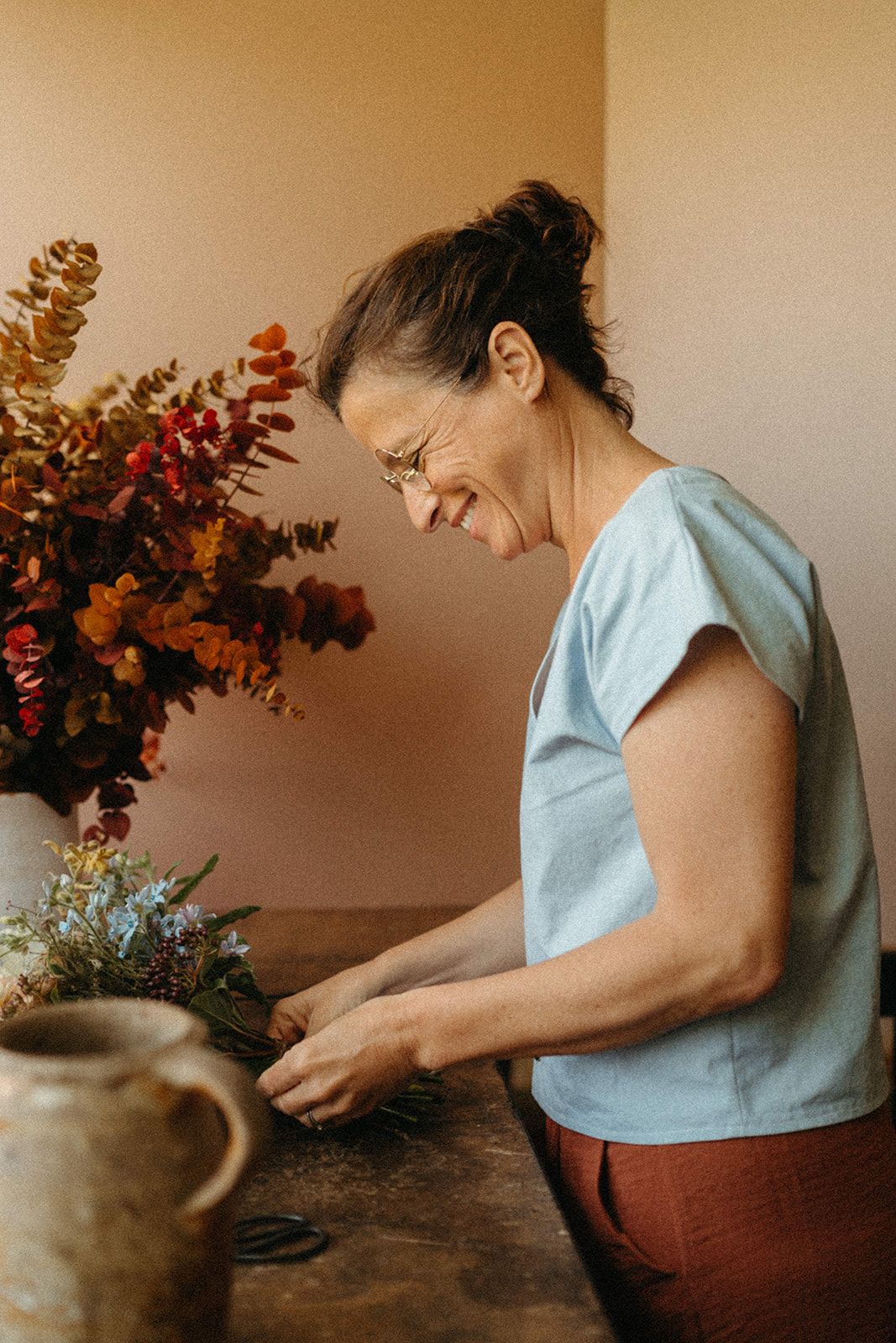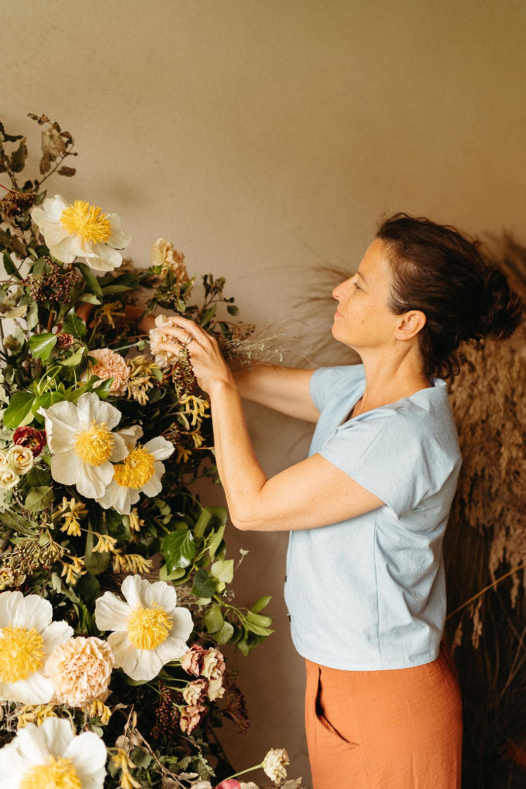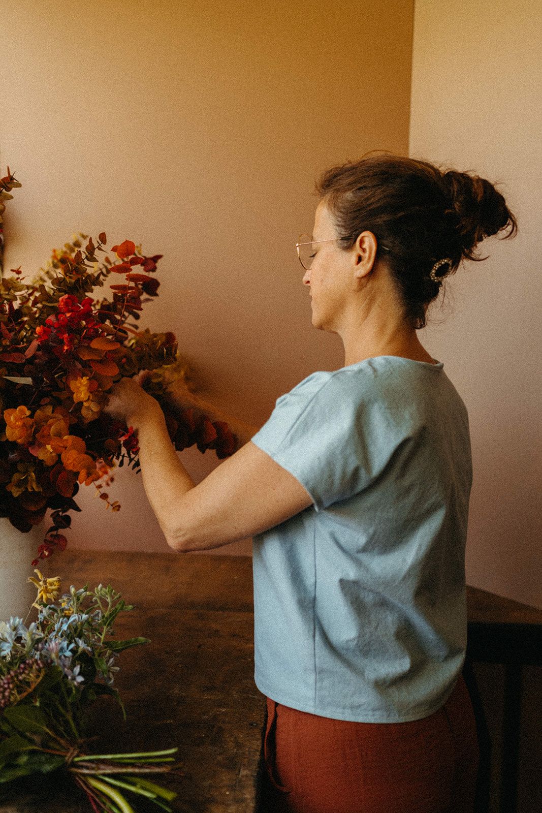 Depuis le début, elle reste fidèle à ses choix : fleurs locales, liens forts avec les producteurs, techniques alternatives à la mousse florale.