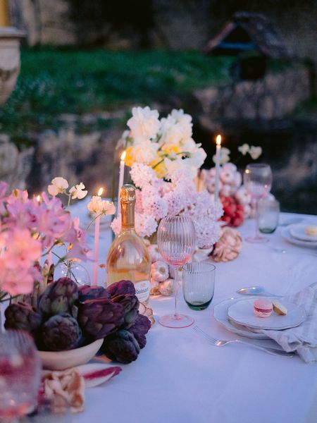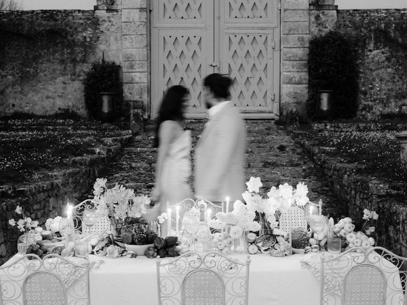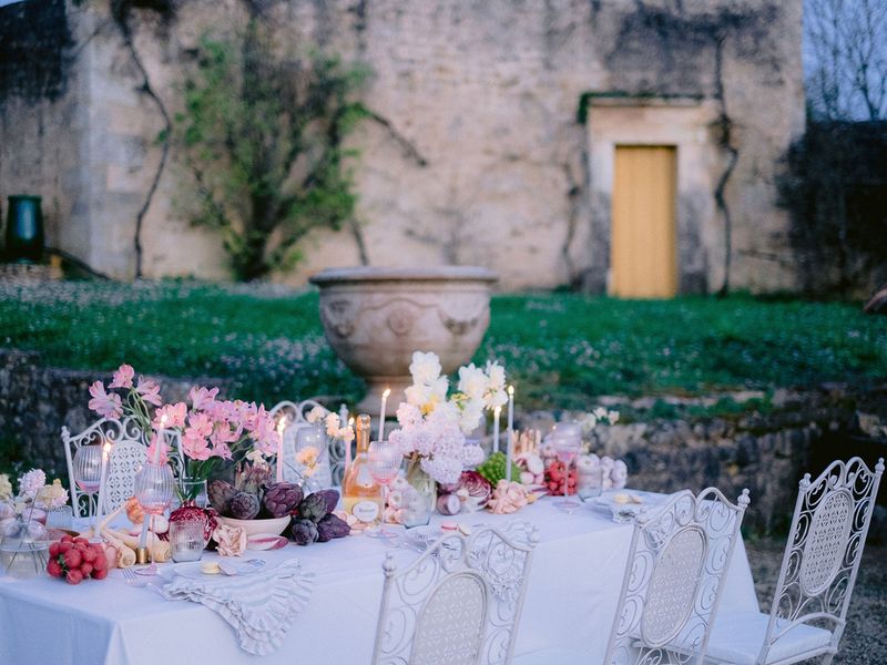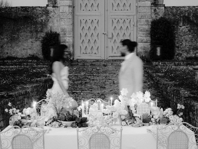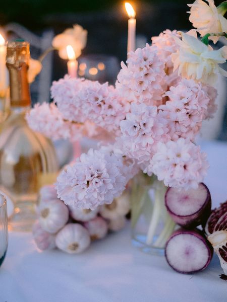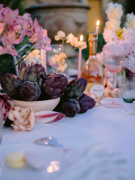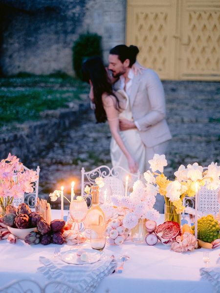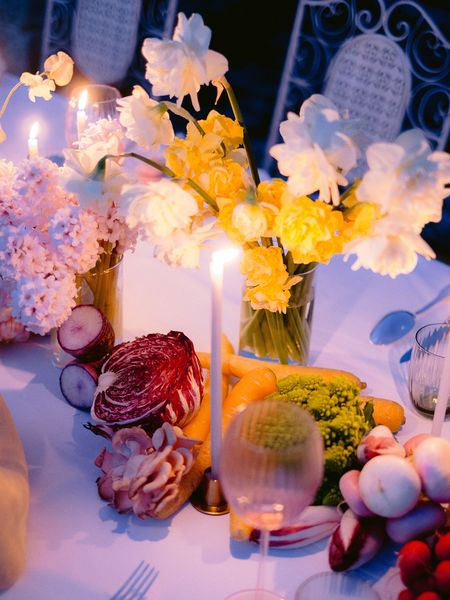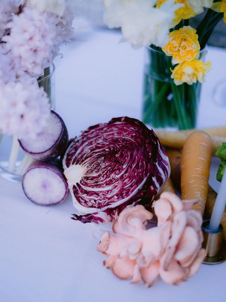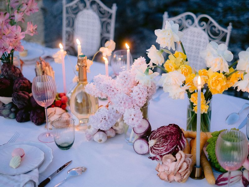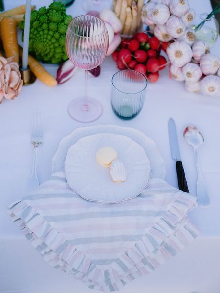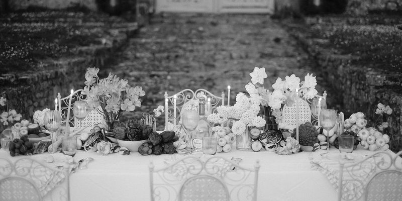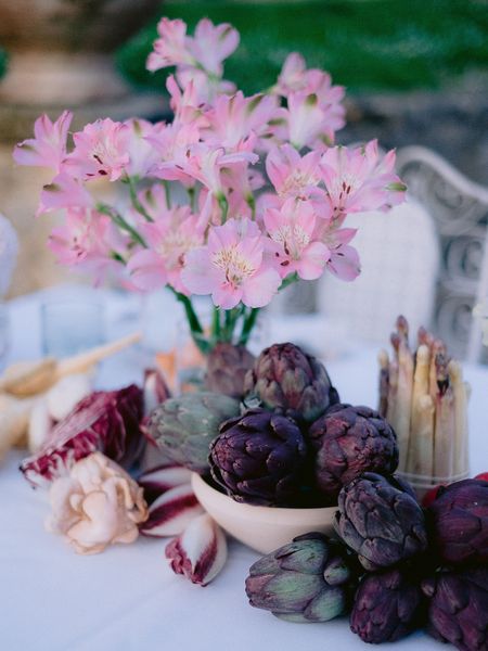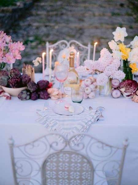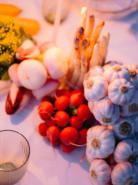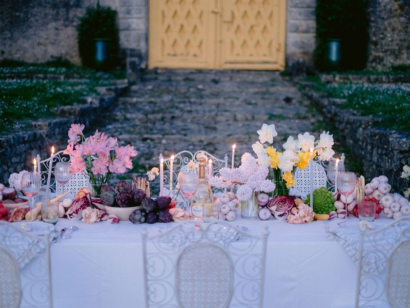 We wanted to transcribe timeless French elegance & chic, but in a modern and fresher way. Hence the idea of this al fresco rehearsal dinner, more casual, with a ‘farm to table’ floral design including veggies along with spring flowers.