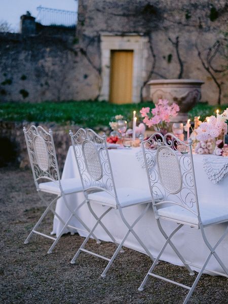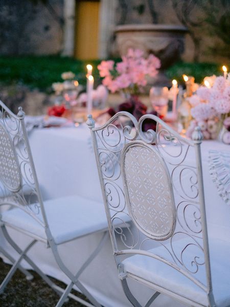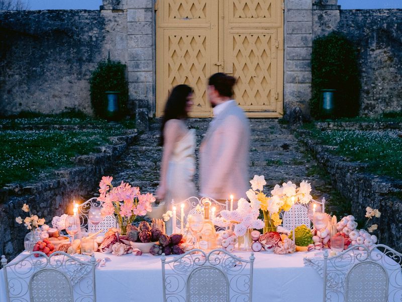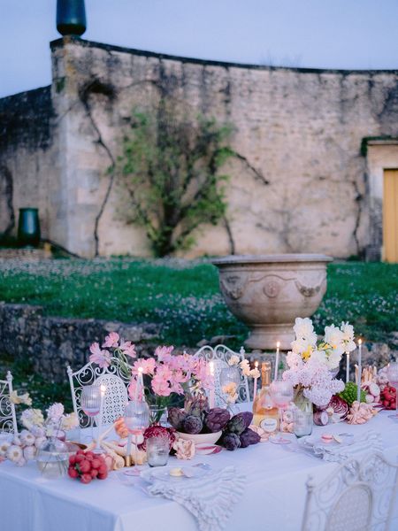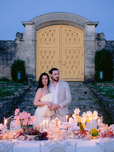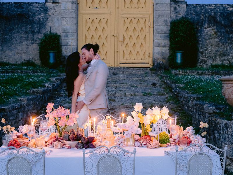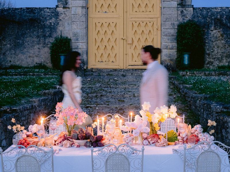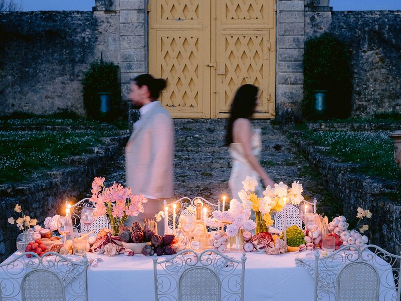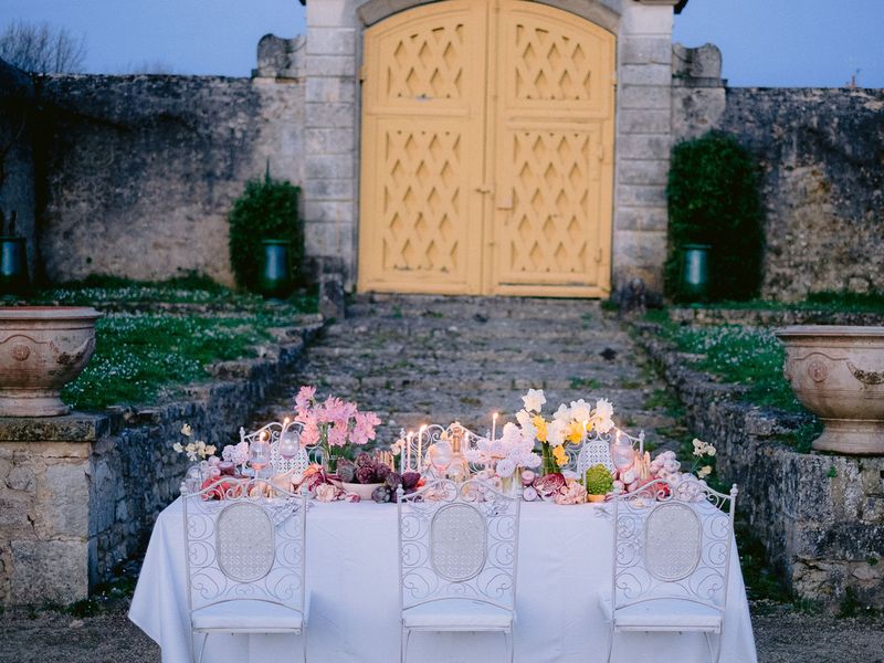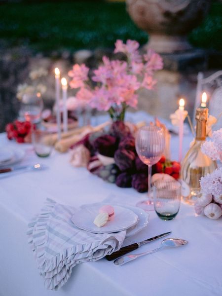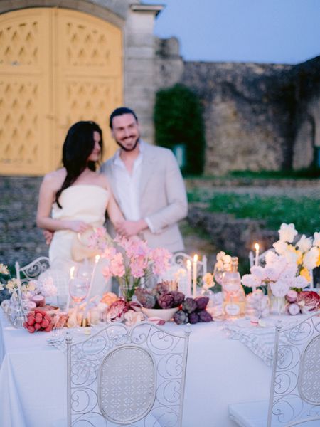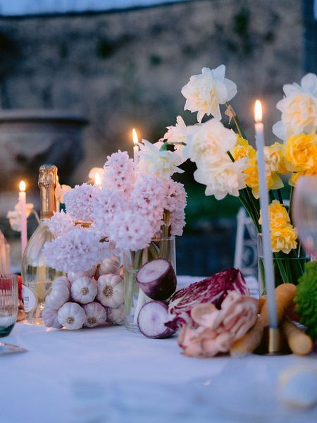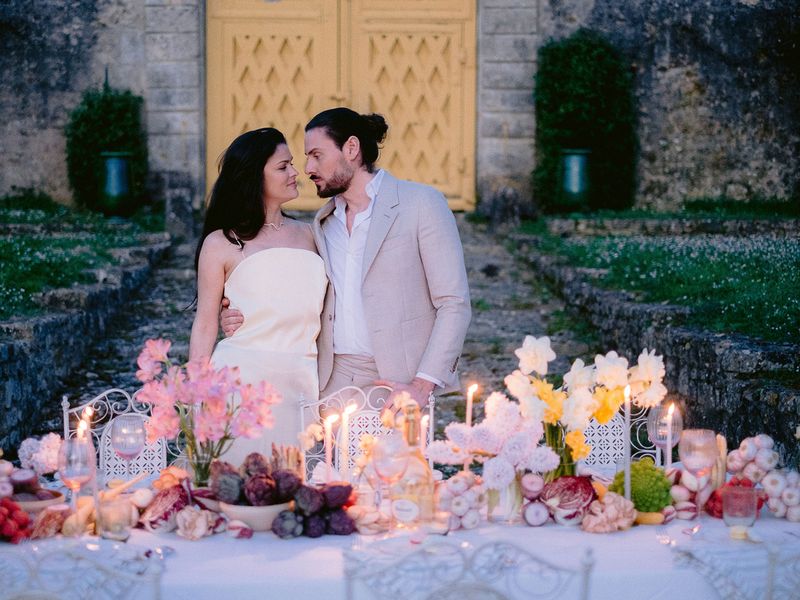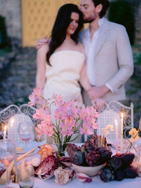 We wanted to transcribe timeless French elegance & chic, but in a modern and fresher way. Hence the idea of this al fresco rehearsal dinner, more casual, with a ‘farm to table’ floral design including veggies along with spring flowers.