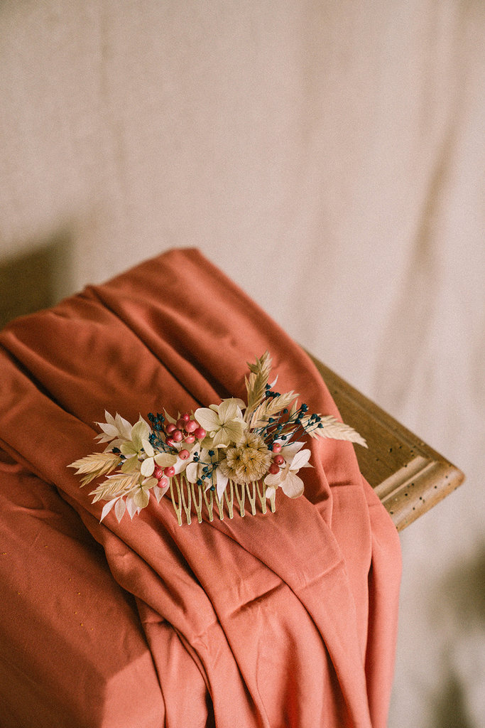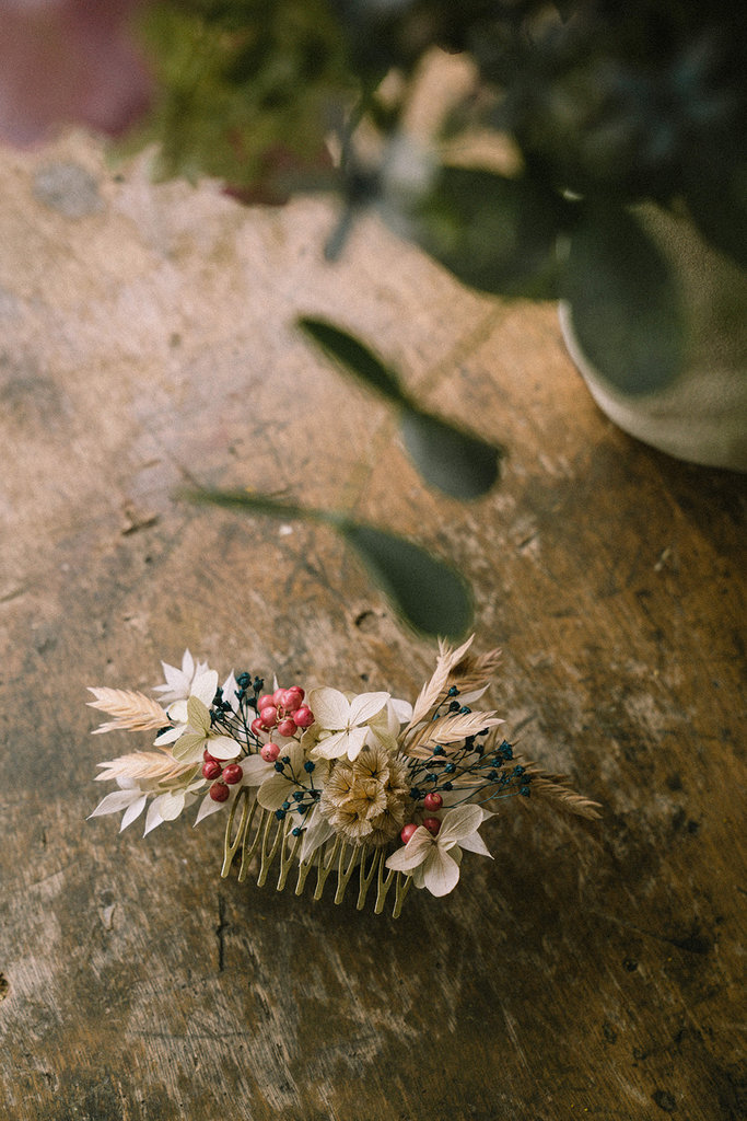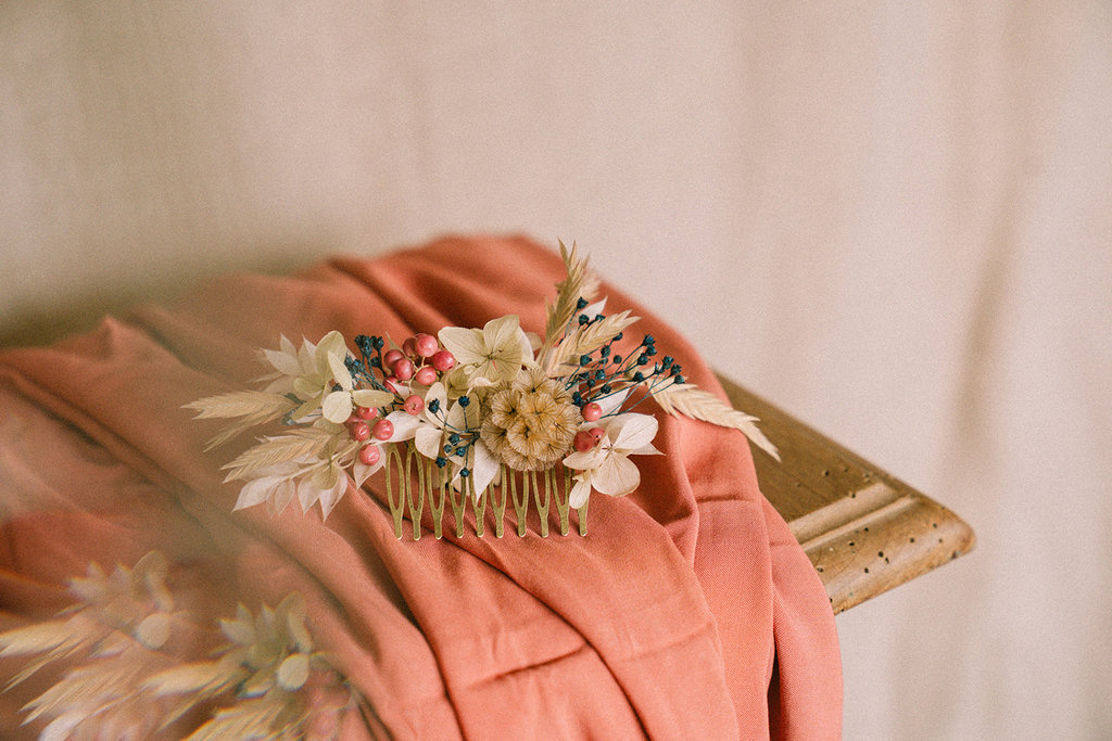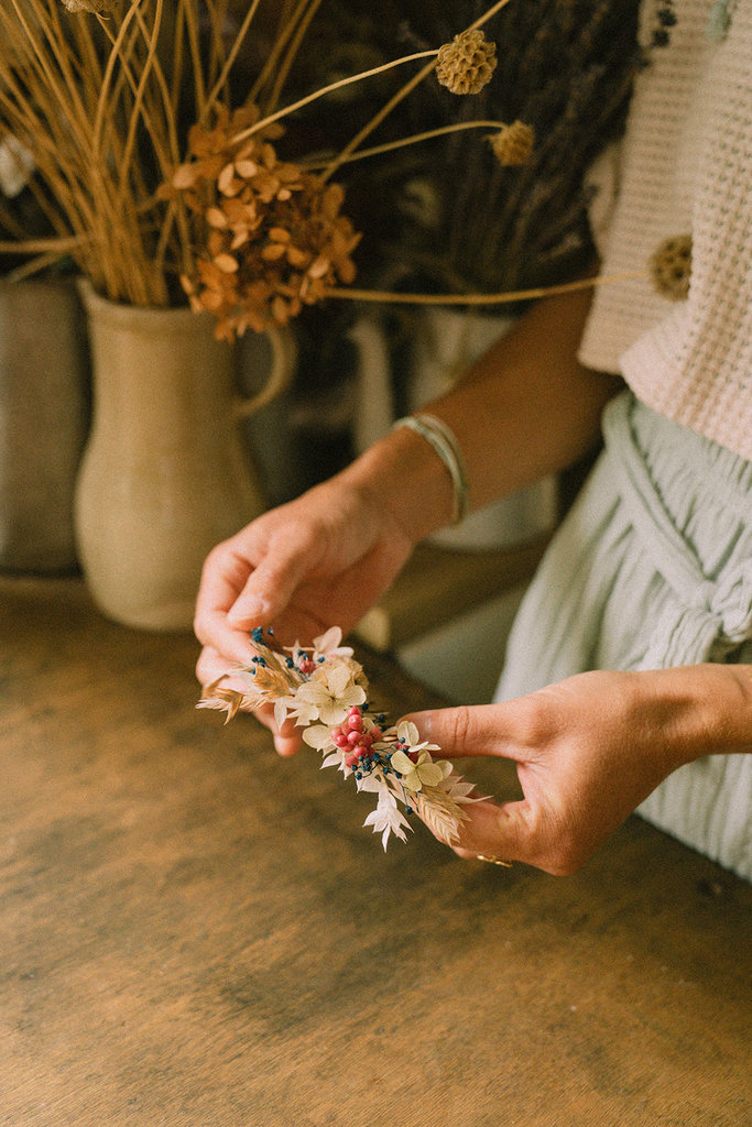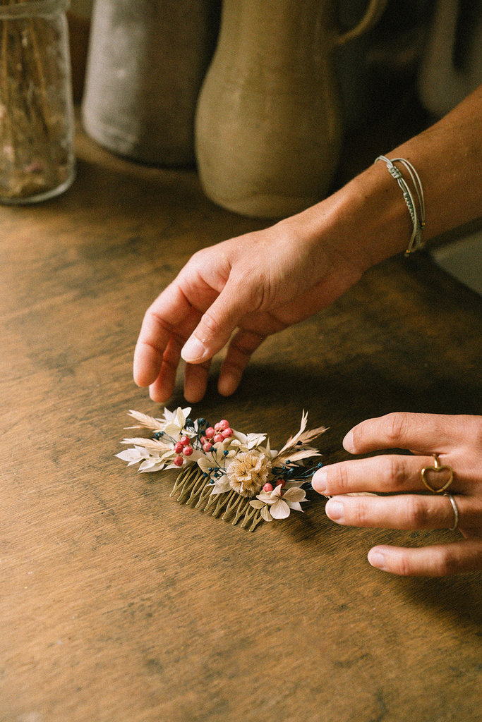 Nous avons abordé la composition sans mousse florale, le bouquet lié vrillé, ainsi que les accessoires avec la création d’un peigne fleuri.