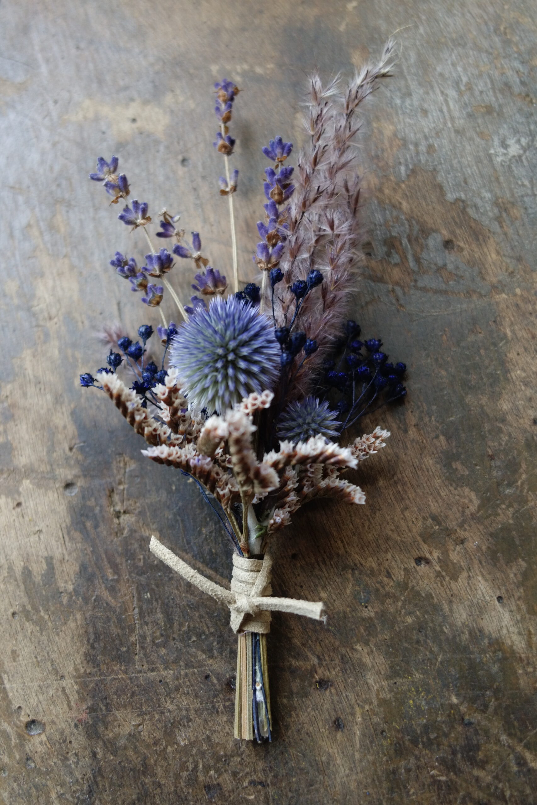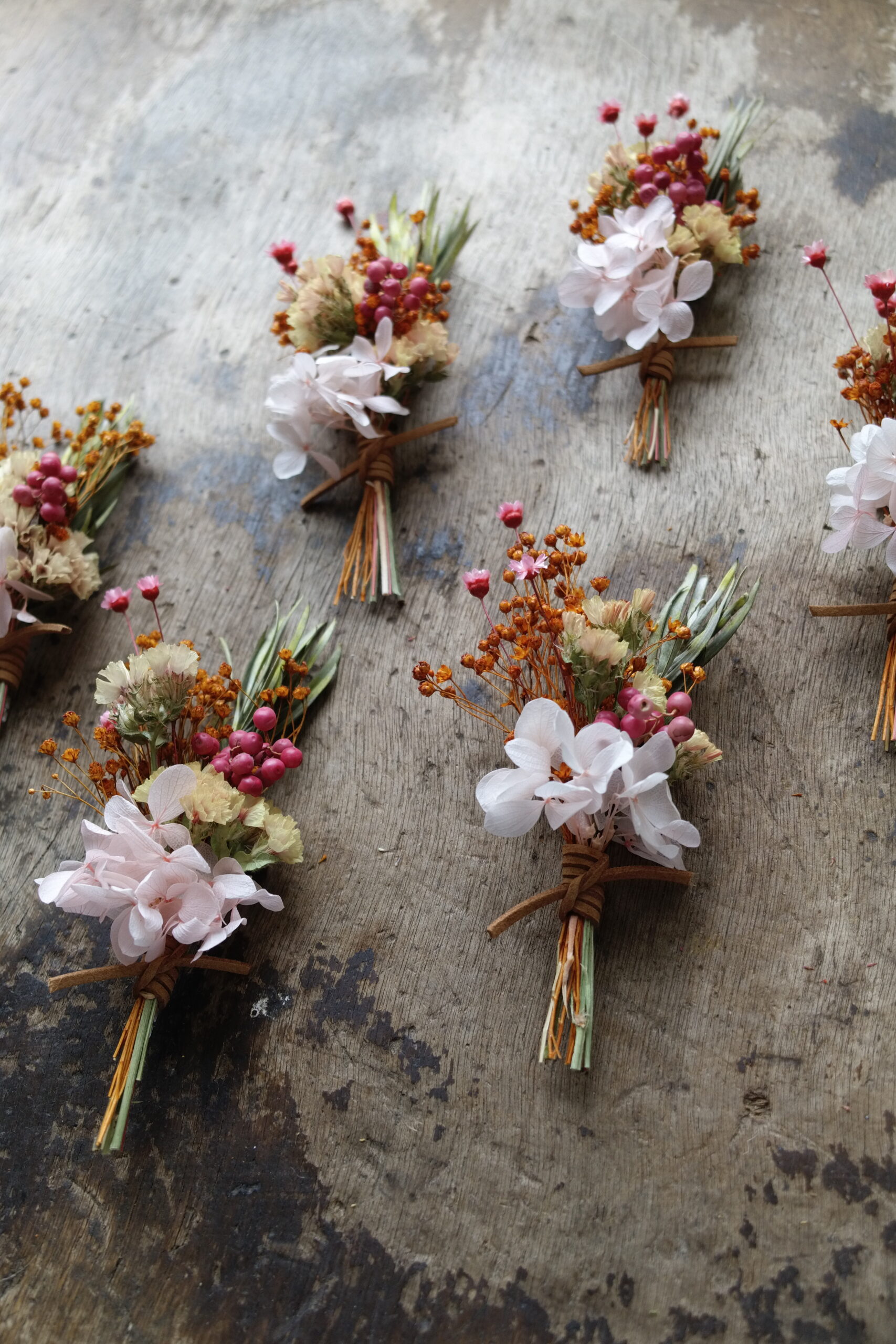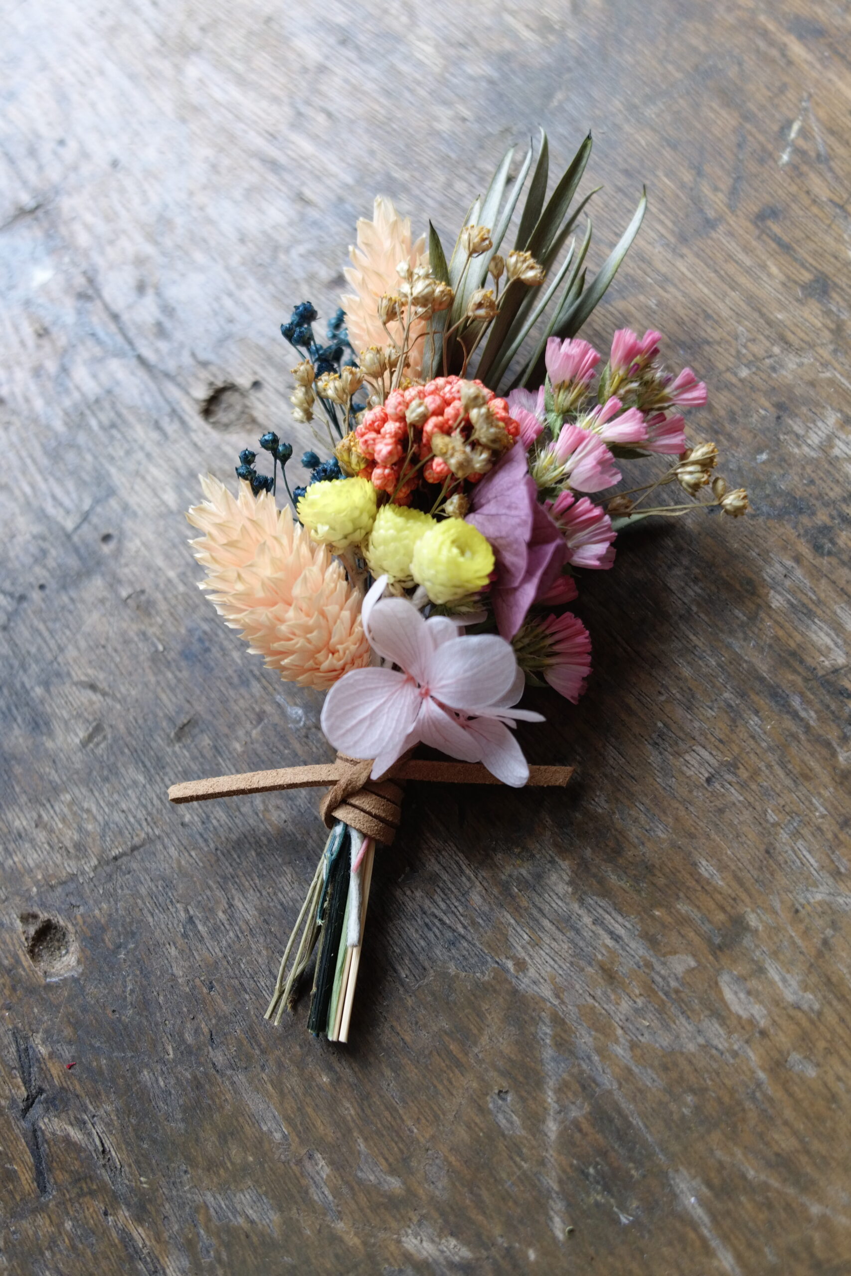 Cette boutonnière en fleurs séchées est un accessoire élégant pour mariage ou événement.
