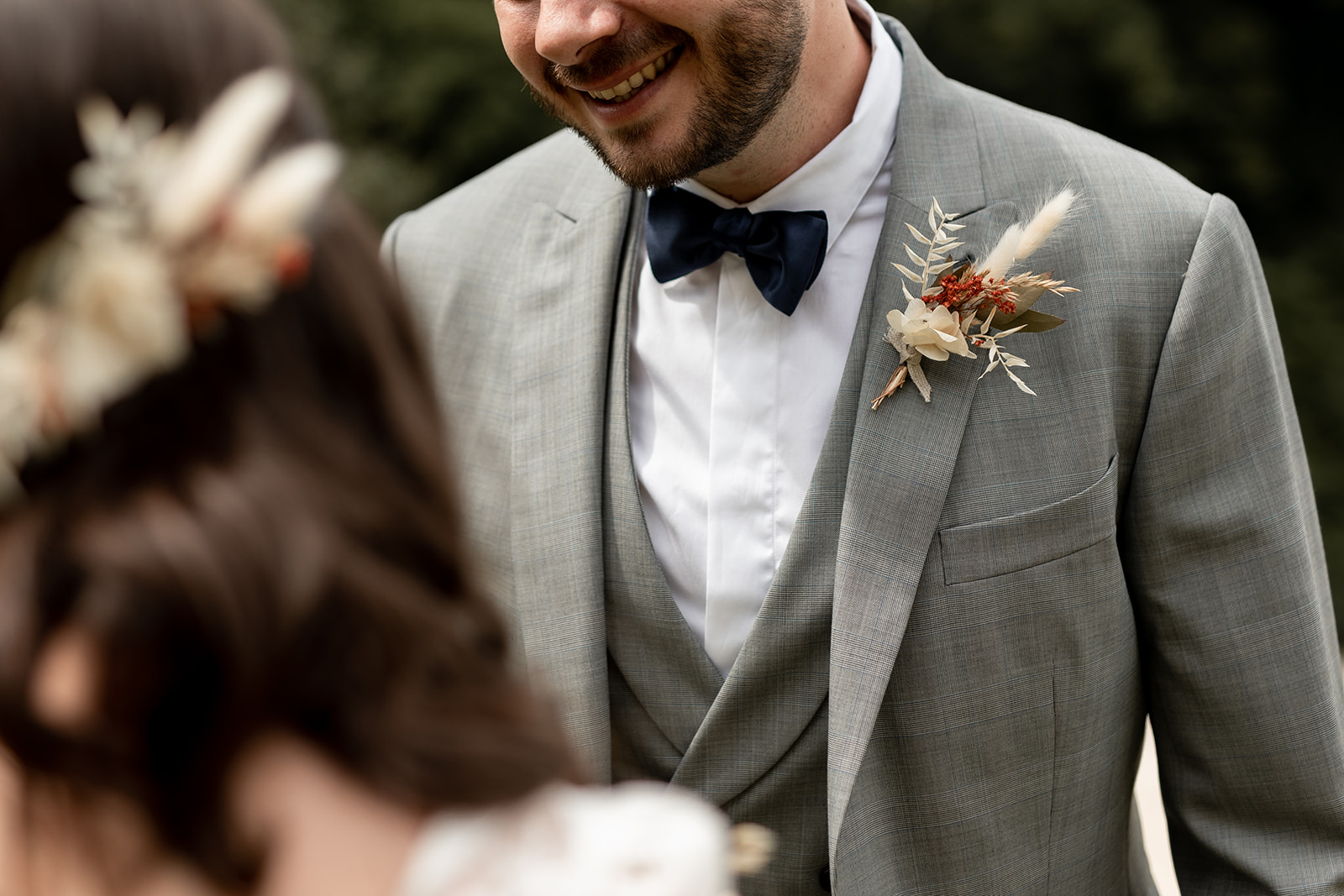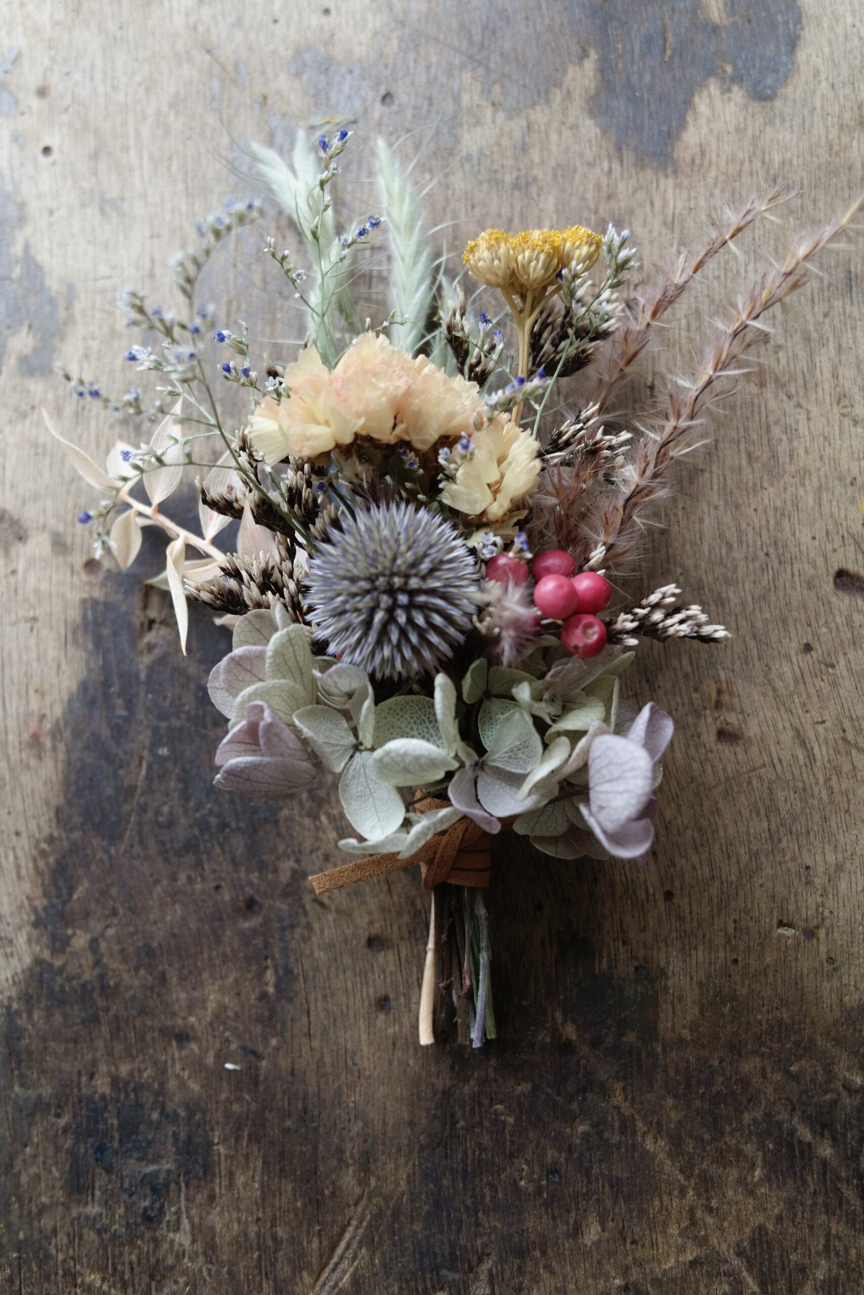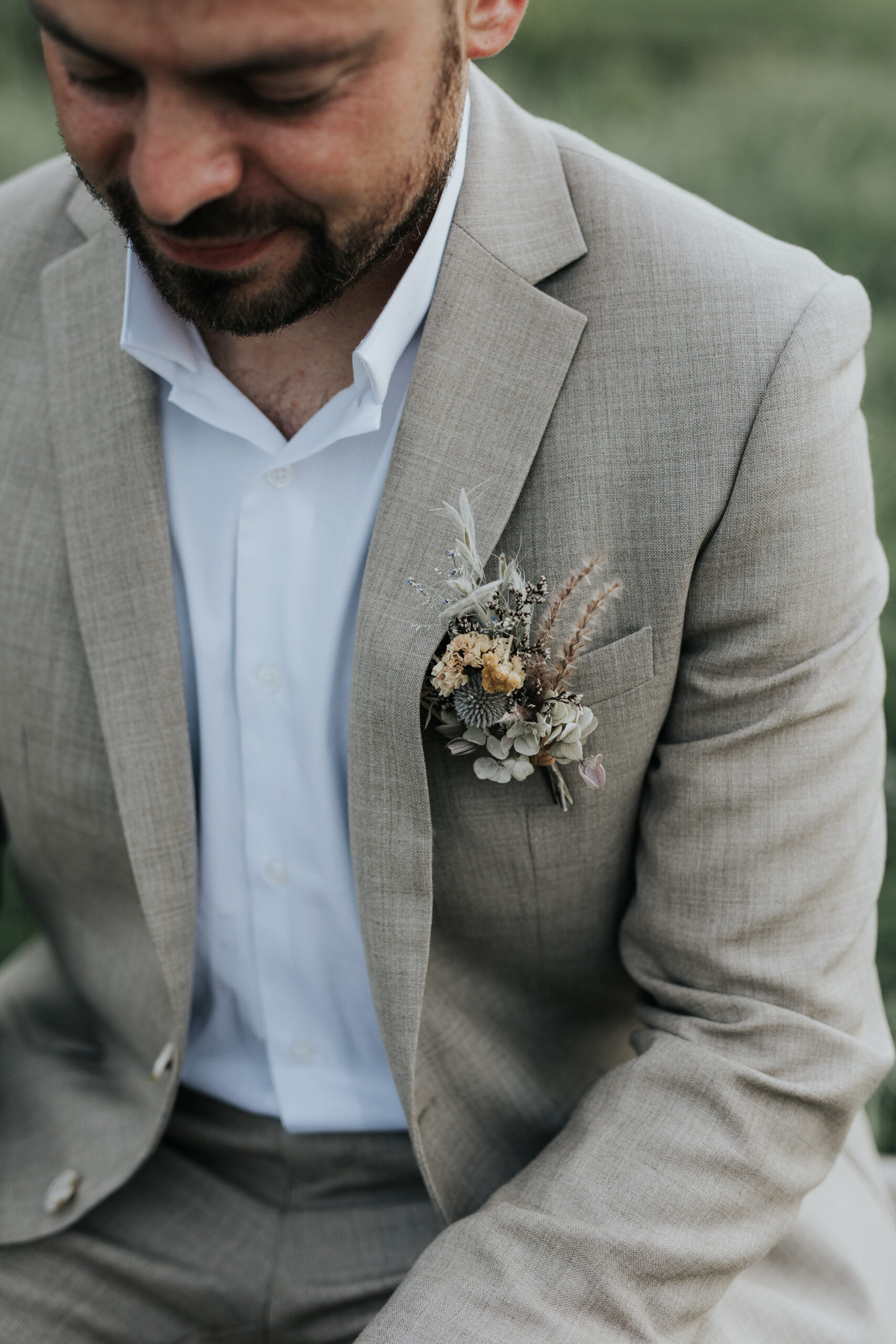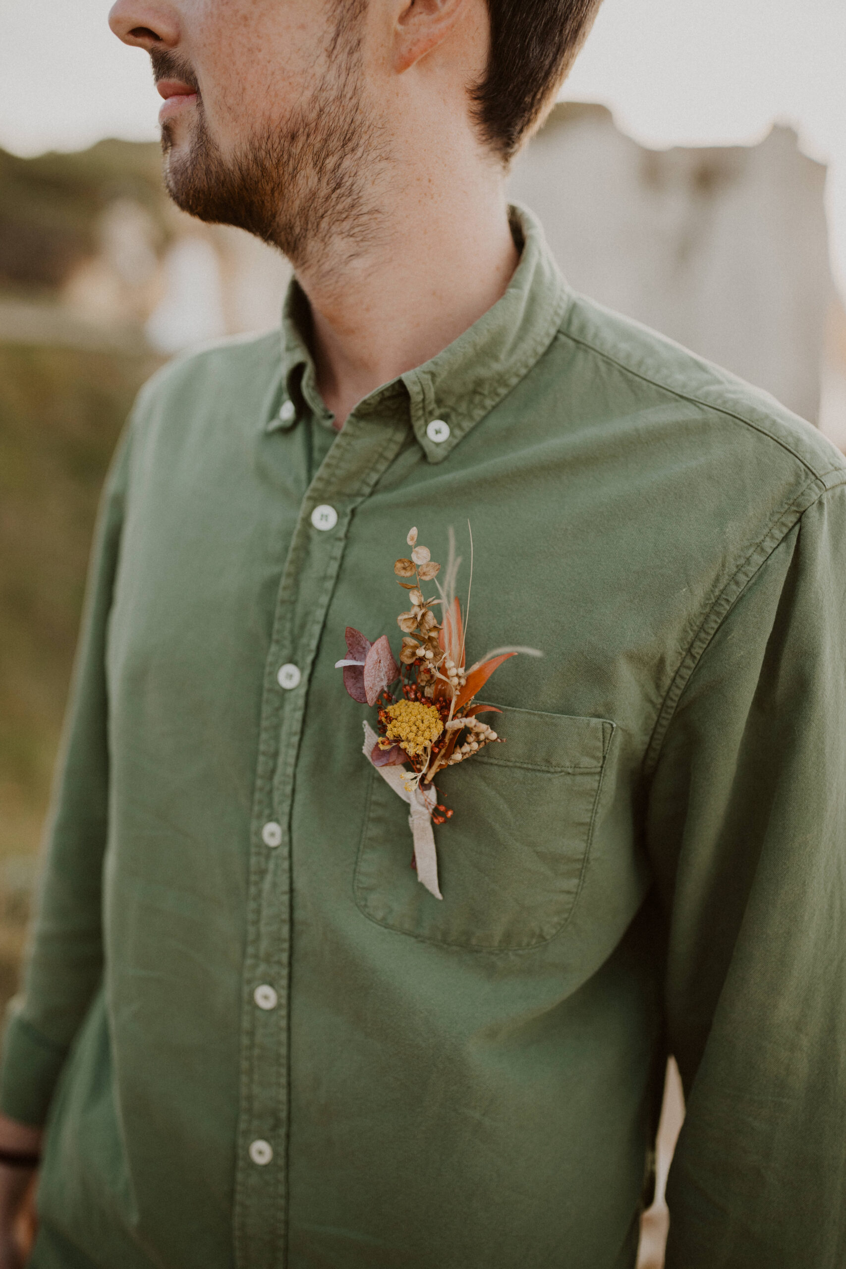 Cette boutonnière en fleurs séchées est un accessoire élégant pour mariage ou événement.