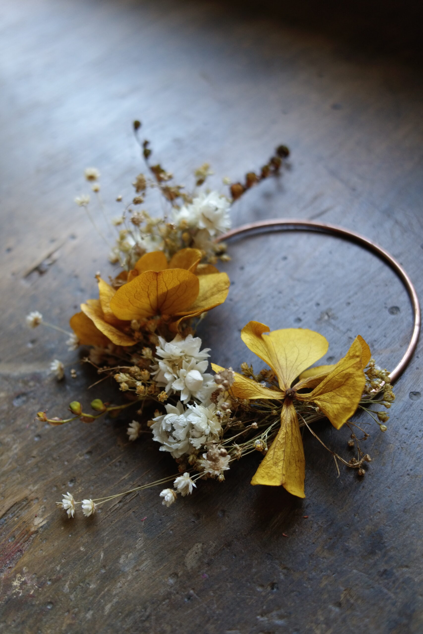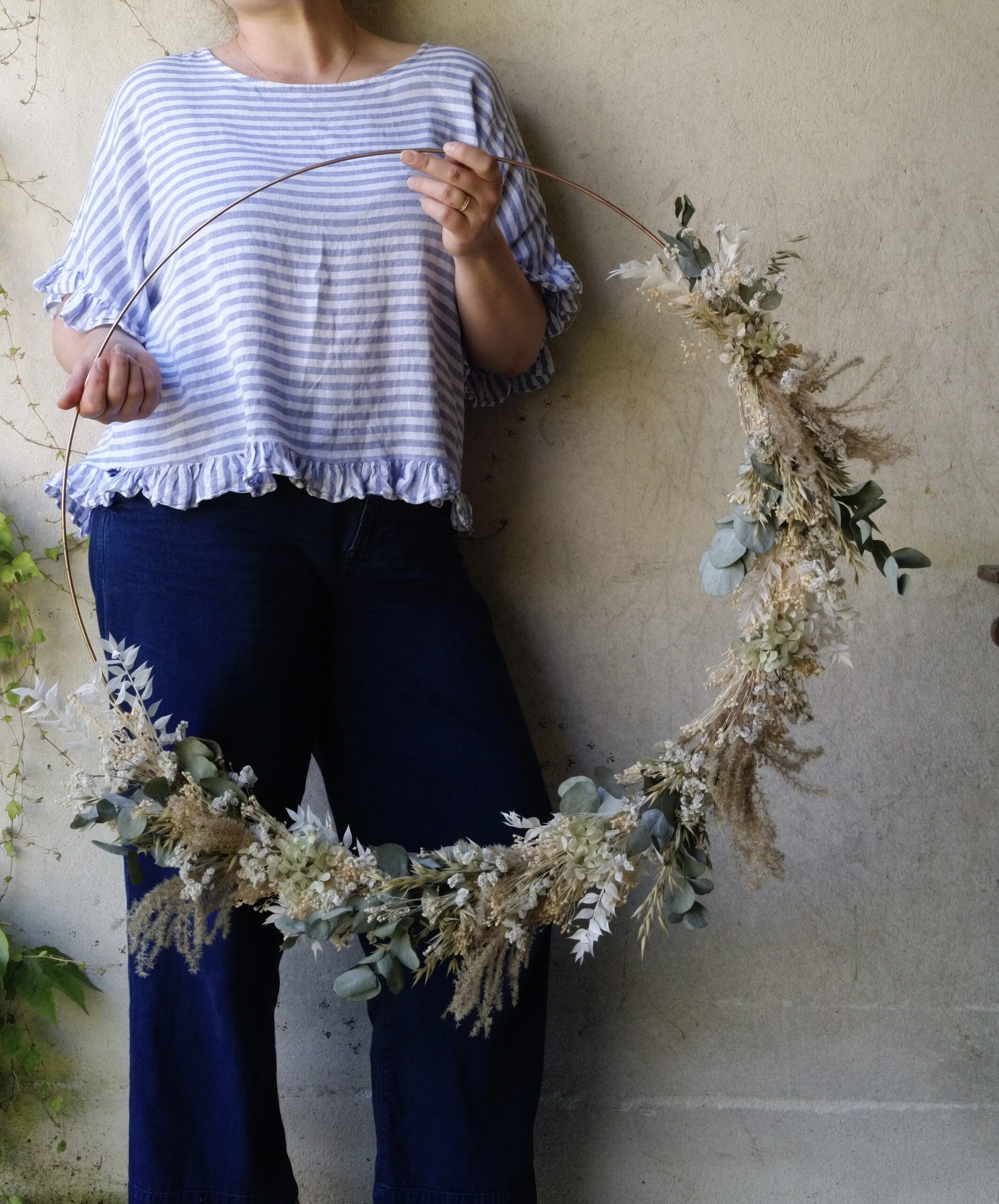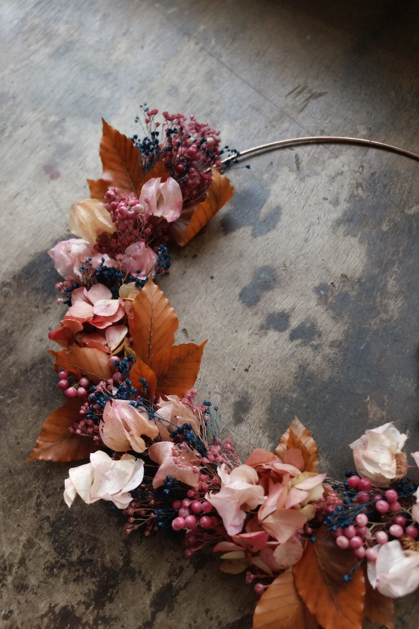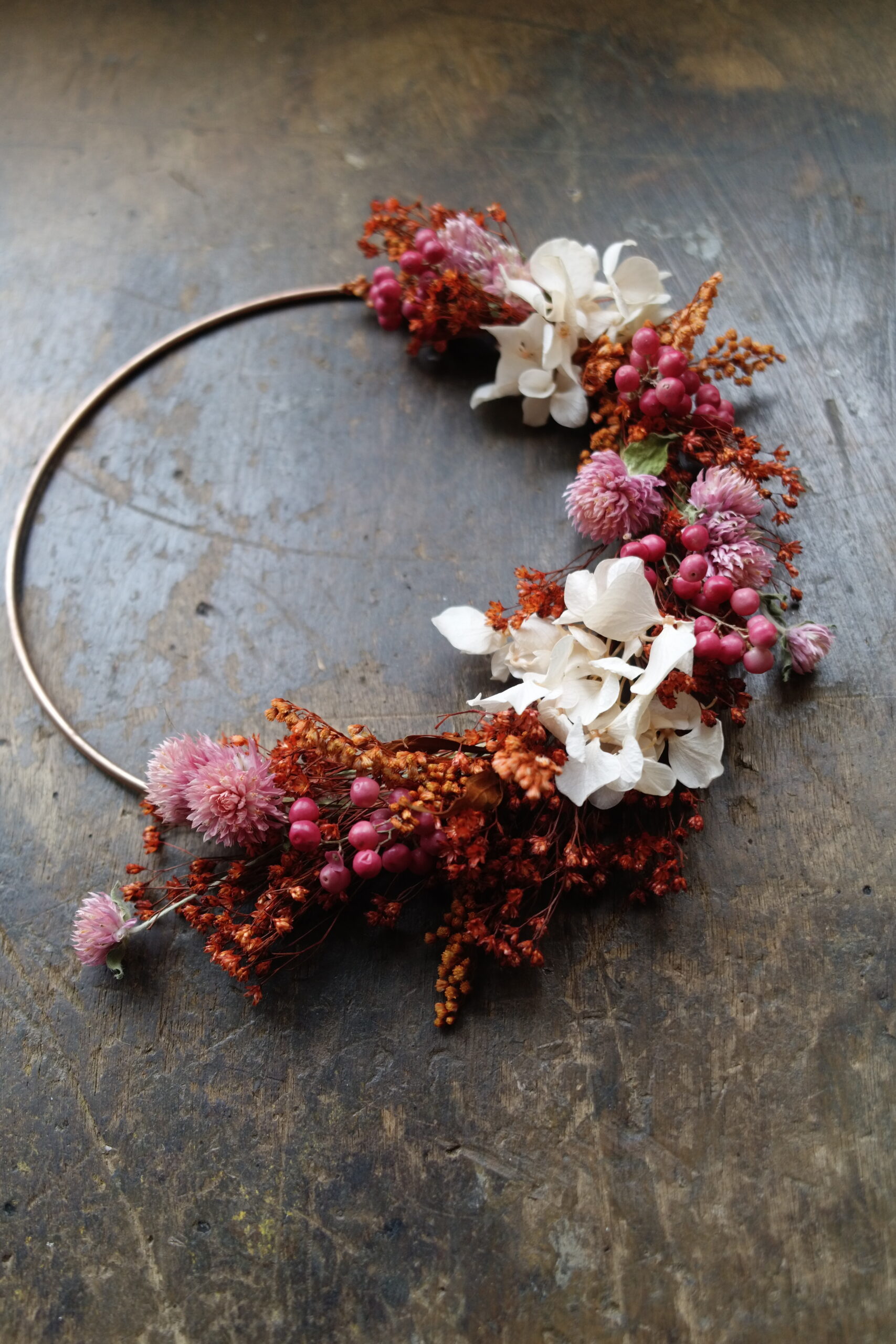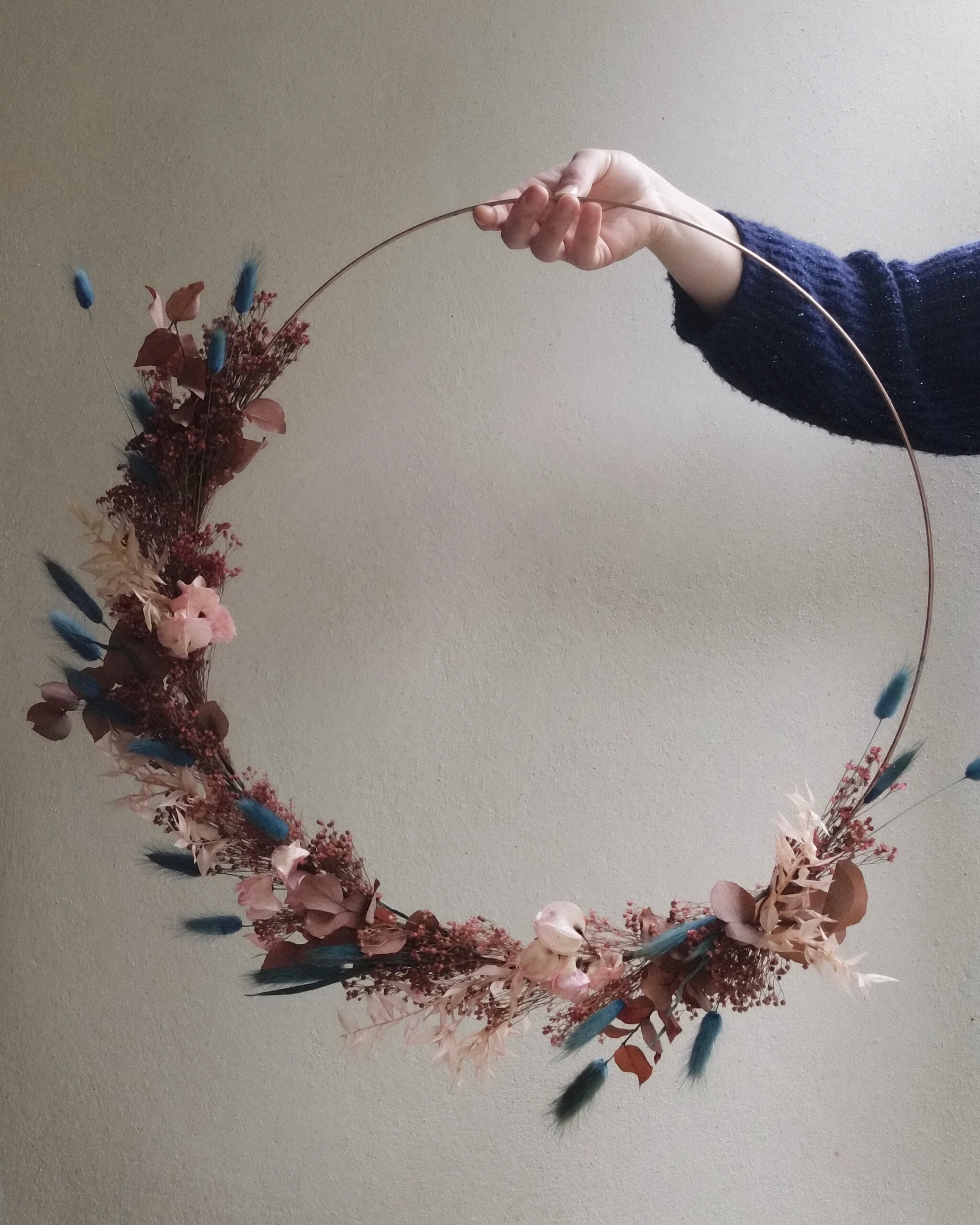 Cette couronne en fleurs séchées sur base cuivre apporte une touche végétale légère et contemporaine à votre intérieur.