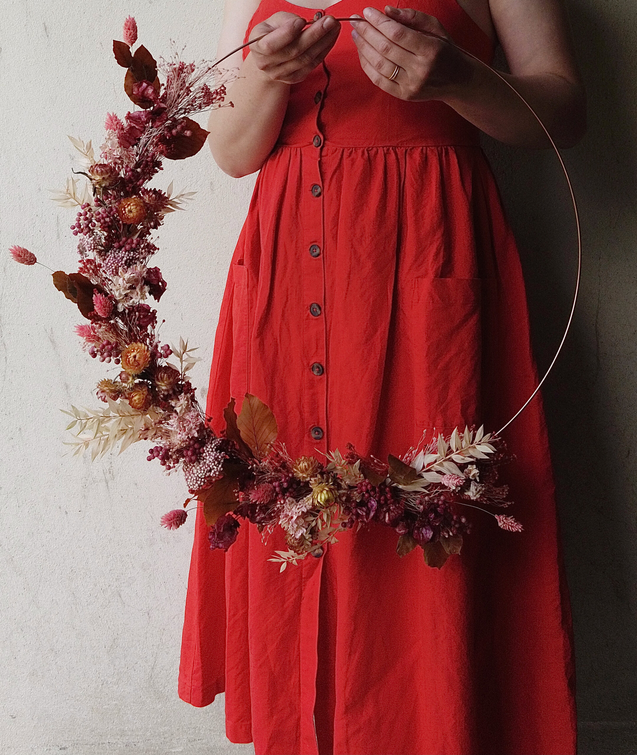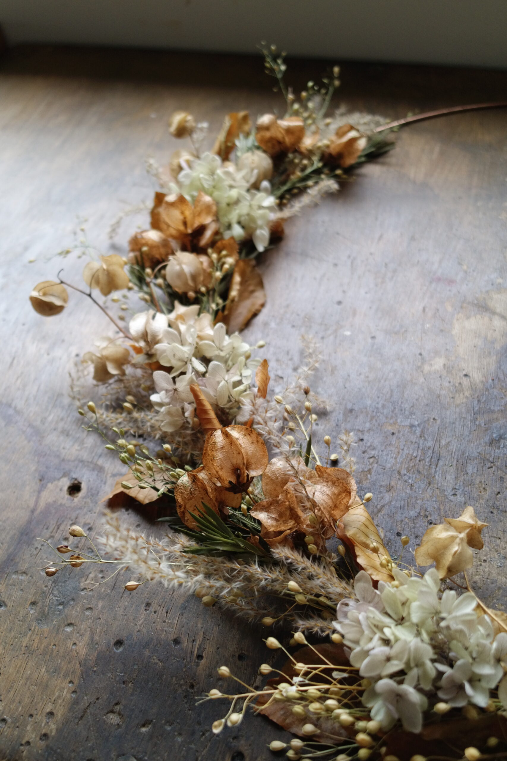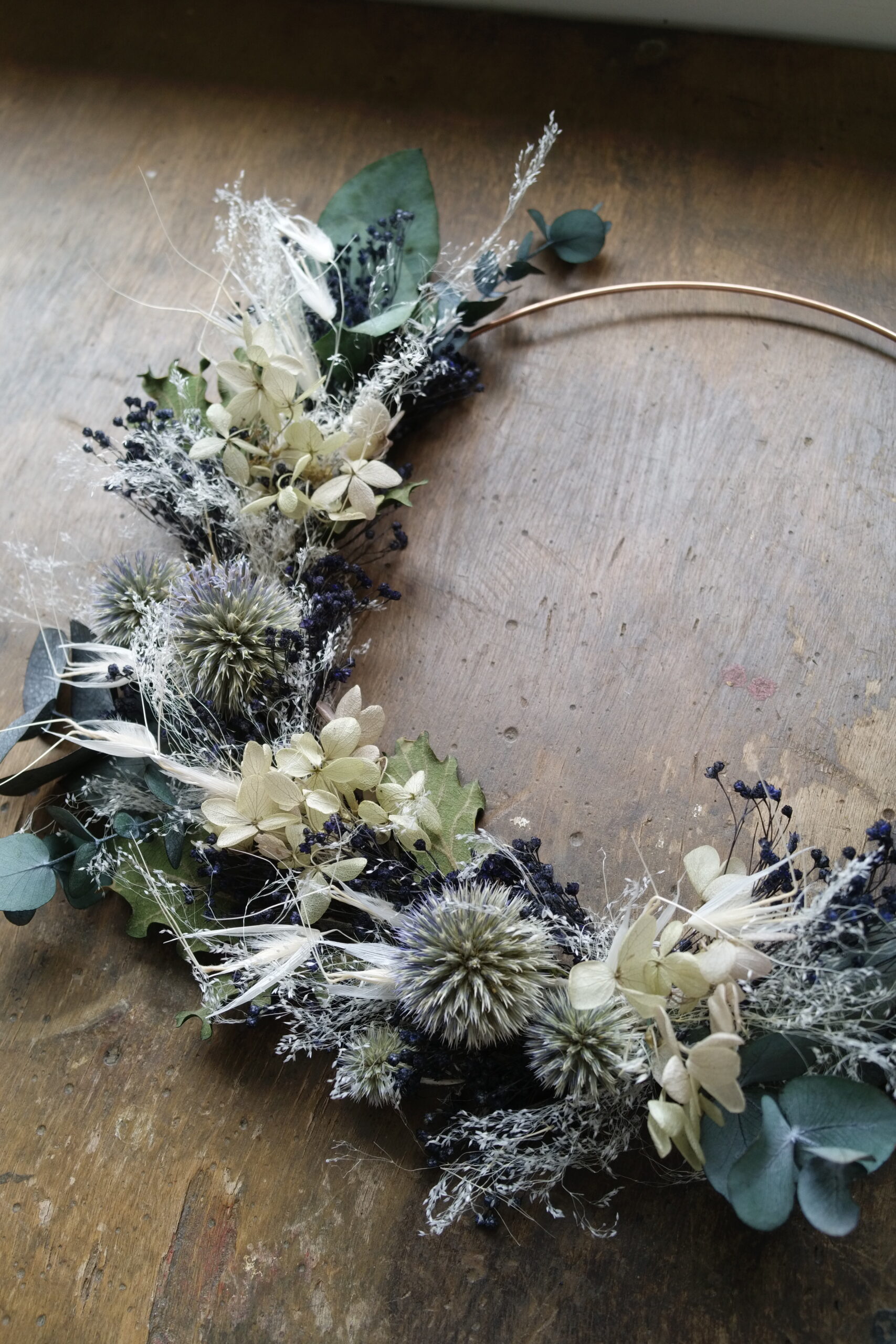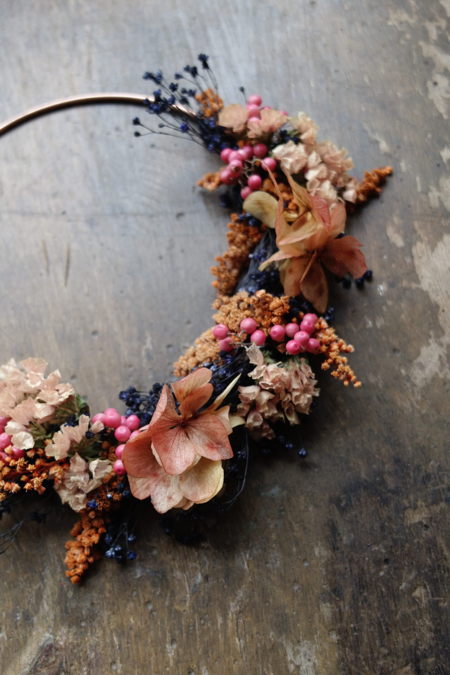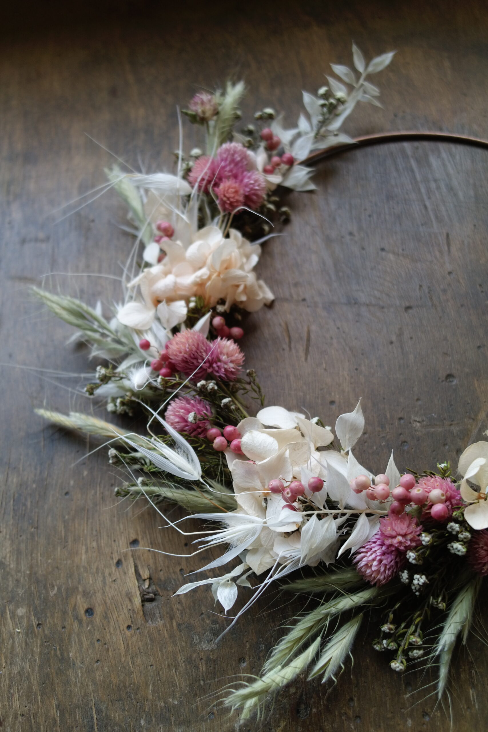 Cette couronne en fleurs séchées sur base cuivre apporte une touche végétale légère et contemporaine à votre intérieur.
