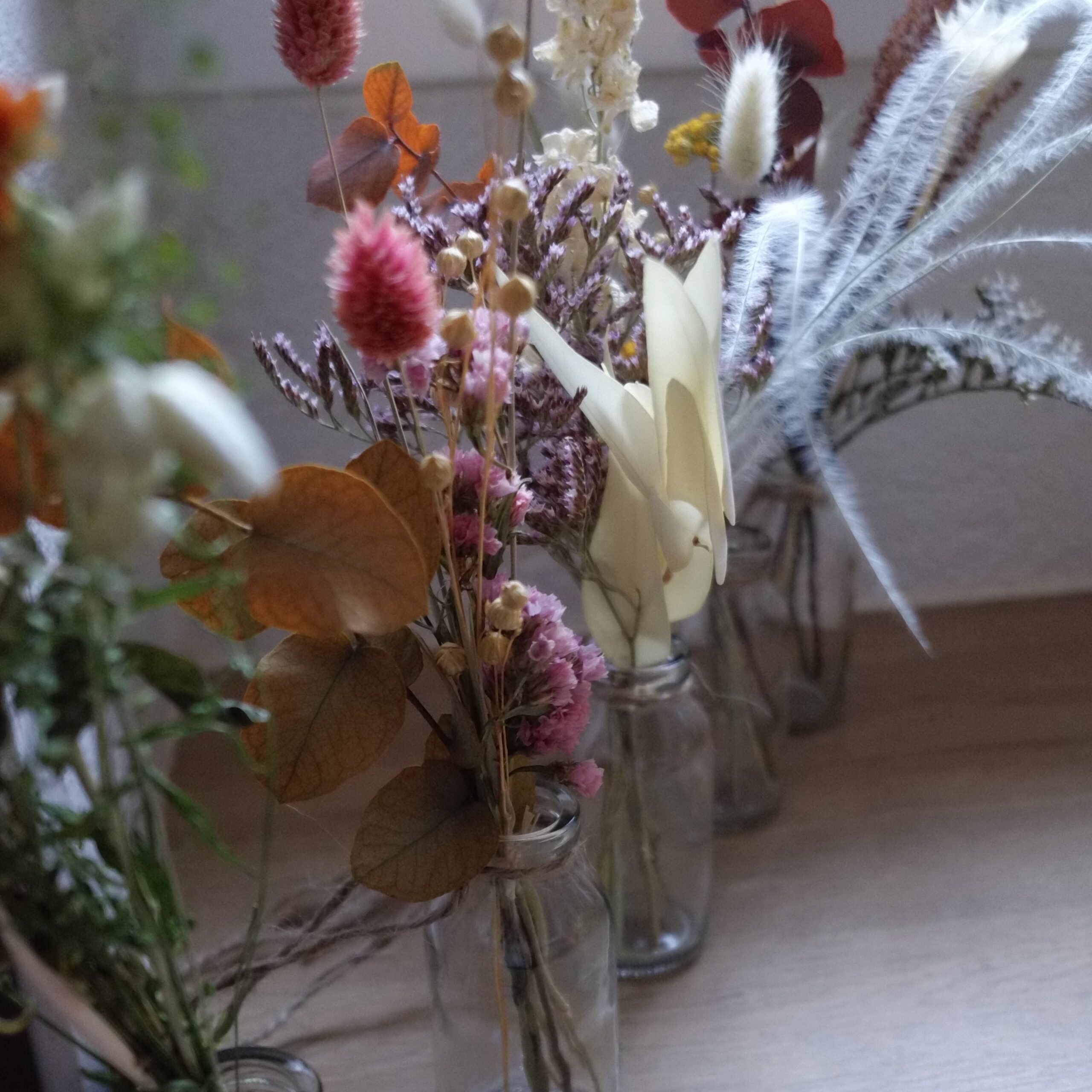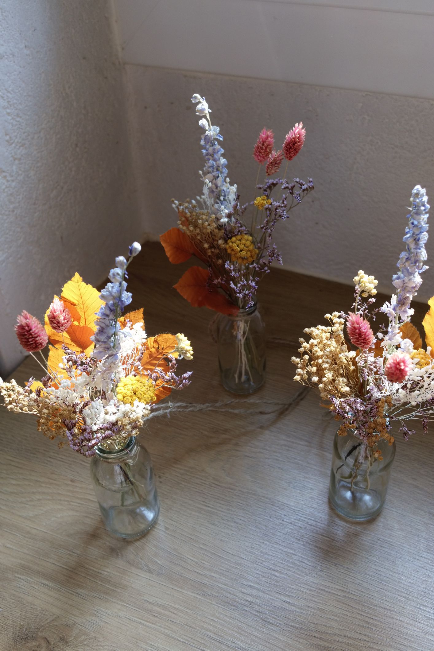 Les fleurs séchées demandent peu d’entretien. Évitez l’humidité et la lumière directe du soleil et dépoussiérez de temps en temps avec un sèche-cheveux position air froid, vos créations vous accompagneront pendant des années!